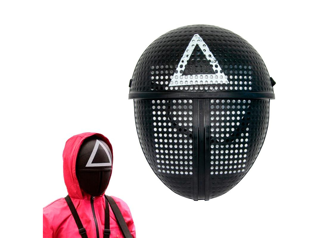 Маска из Игры в Кальмара с треугольником изготавливается из прочного, легкого пластика, не вызывающего аллергических реакций. Модель легко надевается и надежно фиксируется на голове пользователя. Лицевая сторона изделия выполнена в виде сеточки, что позволяет скрыть лицо, при этом открыв широкий обзор. Треугольник будет свидетельствовать о том, что игрок – охранник, следящий за соблюдением правил и контролирующий игровой процесс. Данная маска позволит игрокам весело провести время, имитируя «игры в кальмара» вместе с друзьями, проходя всевозможные испытания. С такой маской можно придумать множество игр или воссоздать костюм из любимого сериала.