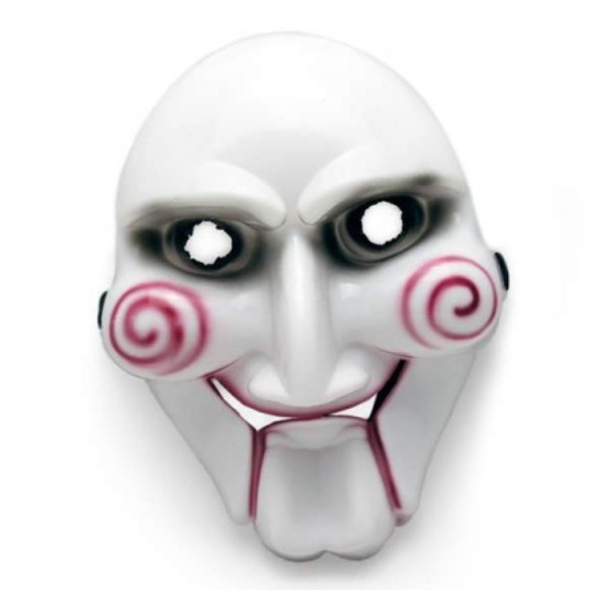 Маска Пила изготовлена из пластика. Белая маска с скрасными элементами закрывает все лицо. Размер изделия : универсальный. Маска для вечеринки надежно фиксируется на голове с помощью черной резинки.